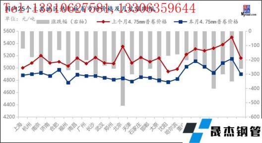 圖6:國內(nèi)25個主要地區(qū)熱軋板卷市場價格及月度漲跌幅