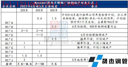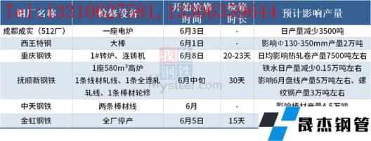 據(jù)不完全統(tǒng)計(jì),截至6月7日,國內(nèi)6家無縫厚壁鋼管廠家發(fā)布檢修計(jì)劃。其中,撫順新鋼鐵計(jì)劃6月中旬起對廠內(nèi)1座580m3高爐進(jìn)行30天左右的年修,預(yù)計(jì)鐵水日產(chǎn)量減少0.15萬噸左右、共影響鐵水產(chǎn)量4.5萬噸左右;同時(shí)1條線材軋線、1條全連軋軋線、1條棒材輪修,預(yù)計(jì)影響6月盤線產(chǎn)量5萬噸左右、螺紋鋼產(chǎn)量3萬噸左右。