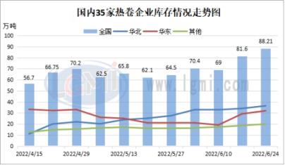 截止2022年6月24日,據云商平臺監測數據顯示,國內熱軋卷板社會庫存量約為264.53萬噸,環比增加20.82萬噸。重點城市庫存整體表現不一,華東區域受上海復工復產影響小幅消庫為主,華北、華南庫存持續累庫。具體來看,廣州地區熱卷社會庫存量約為71.00萬噸,環比增加9.09萬噸;上海熱卷社會庫存量環比下降4.84萬噸至37.00萬噸;天津熱卷社會庫存量約為8.00萬噸,環比增加0.80萬噸。