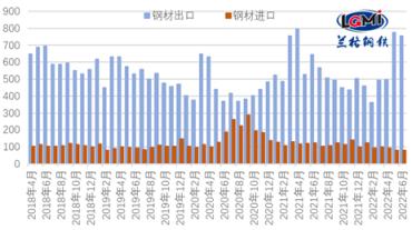 海關(guān)總署發(fā)布數(shù)據(jù)顯示,2022年6月份,我國出口厚壁鋼管755.7萬噸,同比增長17.0%;1-6月份累計出口厚壁鋼管3346.1萬噸,同比下降10.5%。6月份,我國進口厚壁鋼管79.1萬噸,同比下降36.8%;1-6月累計進口厚壁鋼管577.1萬噸,同比下降21.5%(詳見圖1)。