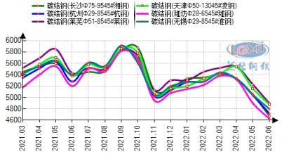 據云商平臺監測數據顯示,截至6月30日,全國十大主導城市碳結鋼(45#)平均價格4848元,較年初跌398元。合結鋼(40Cr)平均價格5097元,較年初跌363元。