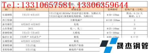上半年無縫鋼管廠家出廠價格以下調為主要基調,優特鋼尤其普優品種6月中下旬出現虧損,且在需求萎縮、庫存壓力、前景迷茫、無重大政策支撐的情況下,個別無縫鋼管廠家開始增加停產、減產計劃,預計7月份優特鋼產量有所下降,具體檢修情況如下: