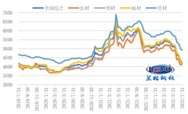 7月份,市場受到市場需求淡季制約,下游實際采購需求釋放力度仍然不足,疊加成本支撐力度的減弱,國內(nèi)厚壁鋼管市場上中旬呈現(xiàn)明顯的弱勢下跌行情,下旬有所企穩(wěn)反彈。據(jù)云商平臺監(jiān)測數(shù)據(jù)顯示,截至7月底,全國厚壁鋼管綜合價格為4324元/噸,較上月末下跌352元/噸,環(huán)比跌幅為7.5%,年同比下跌26.2%。其中,長材價格為4241元/噸,較上月末下跌222元/噸,跌幅5.0%,年同比下跌23.5%;板材價格為4296元/噸,較上月末下跌458元/噸,跌幅為9.6%,年同比下跌29.8%;型材價格指數(shù)為4308元/噸,較上月末下跌442元/噸,跌幅為9.3%,年同比下跌25.9%;管材價格為4927元/噸,較上月末下跌384元/噸,跌幅為7.2%,年同比下跌20.6%(詳見圖1)。