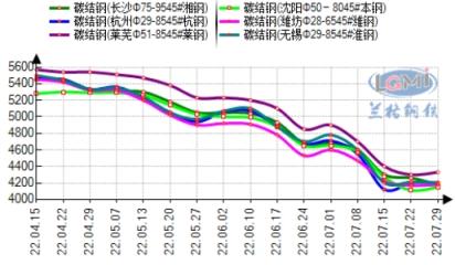 7月份國內優特鋼市場價格大幅下跌。據云商平臺監測數據顯示,截至7月29日,全國碳結鋼(45#)平均價格4347元,較上月同期跌500元左右;全國合結鋼(40Cr)平均價格4588元,較上月同期跌500元左右。因市場成交量較上個月稍有好轉,優特鋼價格震蕩運行,無縫鋼管廠家出貨量稍有增加,無縫鋼管廠家庫存均有小幅下降,但社會庫存持續累積,市場價格短期低位震蕩為主。在價格企穩反彈后,成交量稍有好轉,市場交投氛圍較為積極,剛需與投機均有成交,市場信心提振,不過受限于今年需求遠低于往年同期水平,需求端兌現仍然是一個漫長的道路。