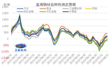 以四周原料庫存測算各品種的毛利表現來看,隨著前期成本的逐步下移,各品種毛利均呈現震蕩回升狀態。研究中心監測數據顯示,8月底,除熱軋卷板及冷軋卷板仍有部分虧損外,其他各品種已重返盈利區間。從月度整體來看,監測的七大品種盈利均有所改善,改善幅度在431-566元/噸之間。其中,三級螺紋鋼的月均盈利改善幅度最大,為566元/噸;中厚板的月均改善幅度最小,為431元/噸;其他品種改善幅度在488-546元/噸之間(詳見圖3)。